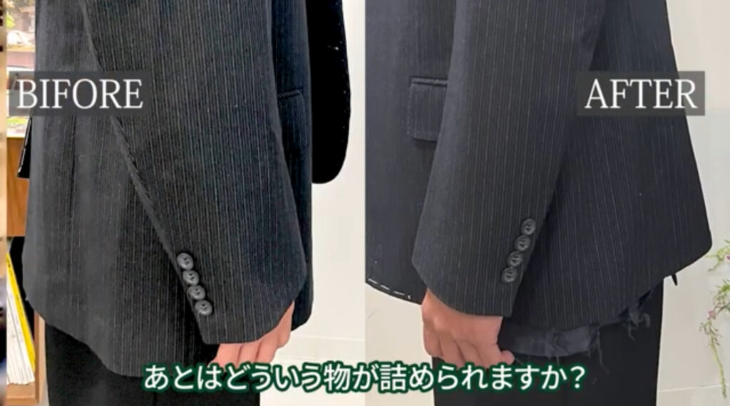 ジャケットの様々な詰め直しについてご紹介いたしましたが、実際にお持ちいただく際には